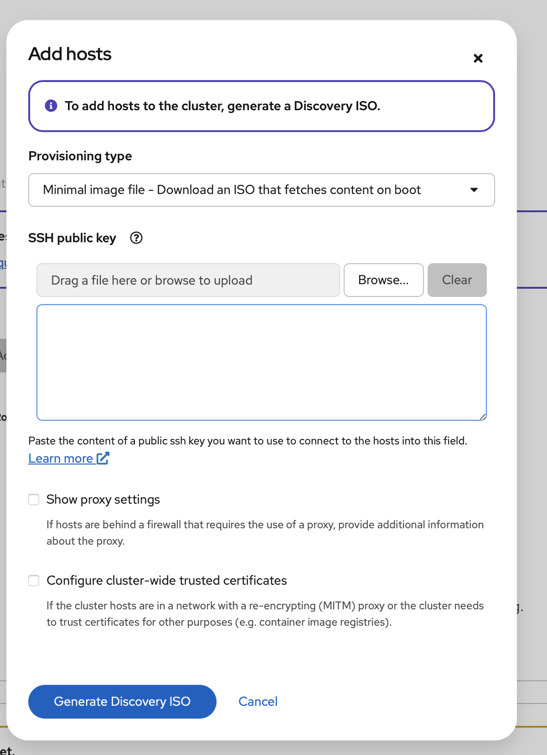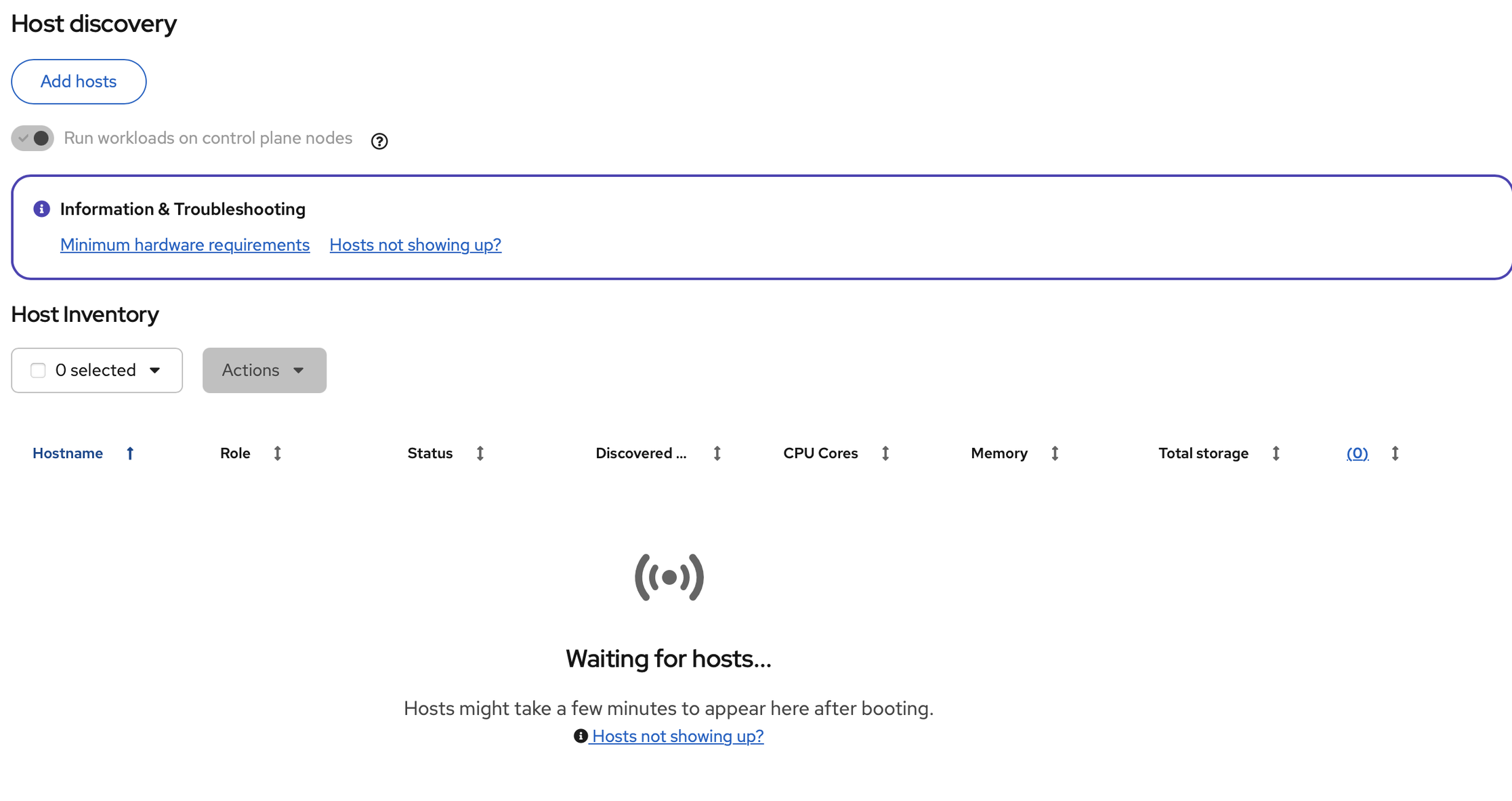 Now I am ready to add the hosts, which requires me to generate a discovery ISO and boot off it. So I click on add host (top left):