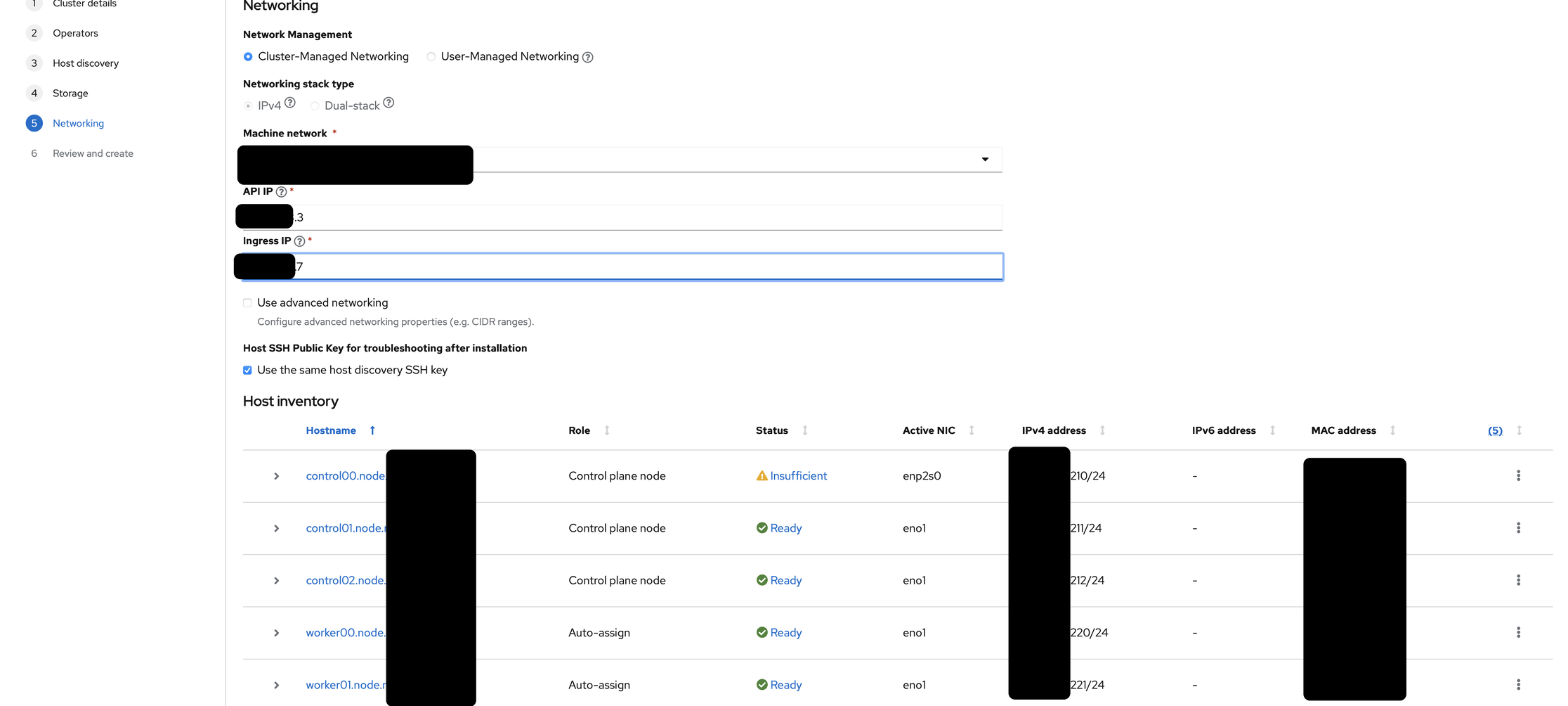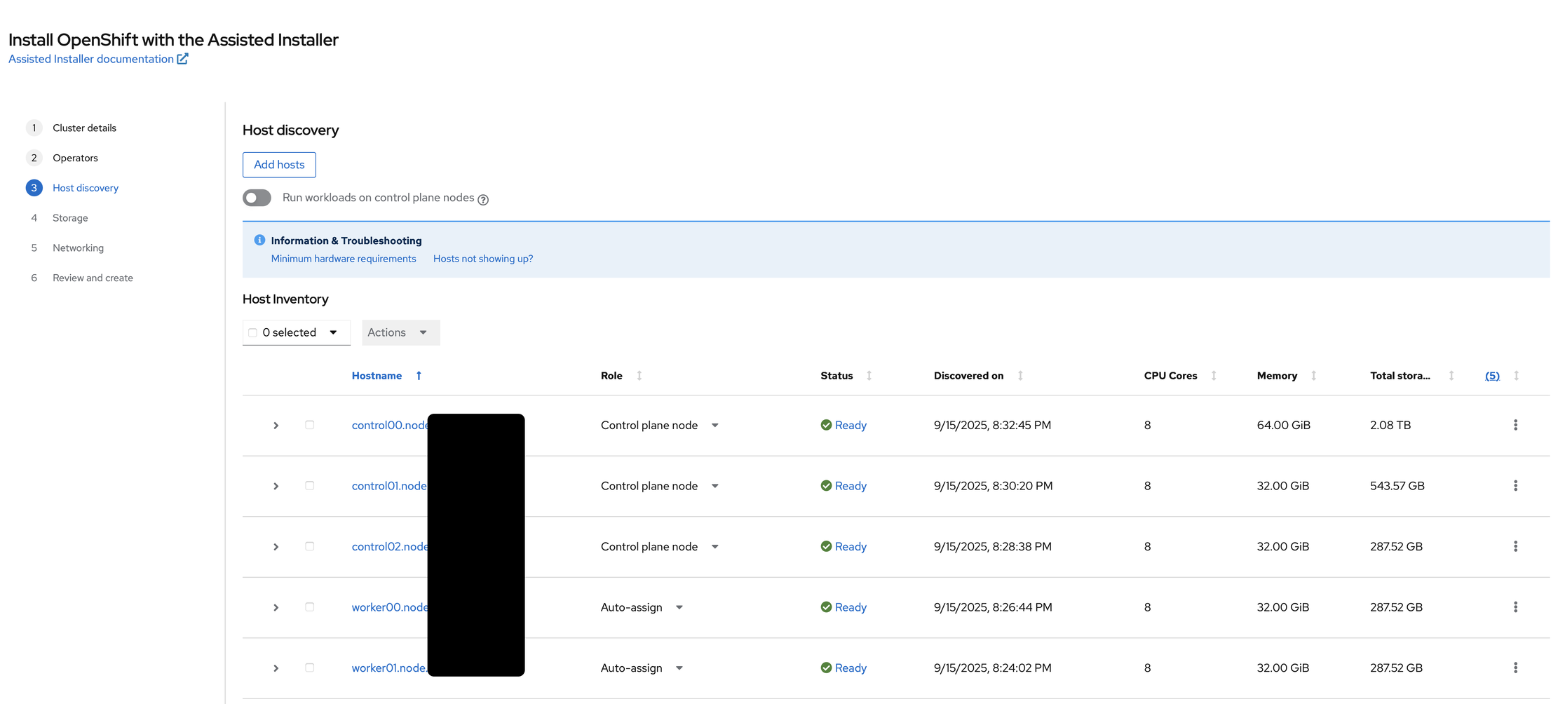 As I boot each machine, they start to show up in the Host inventory, with each machine booted with the hostname I assign to them via DHCP. As they start up, I ether assign them the control plane role or worker role: